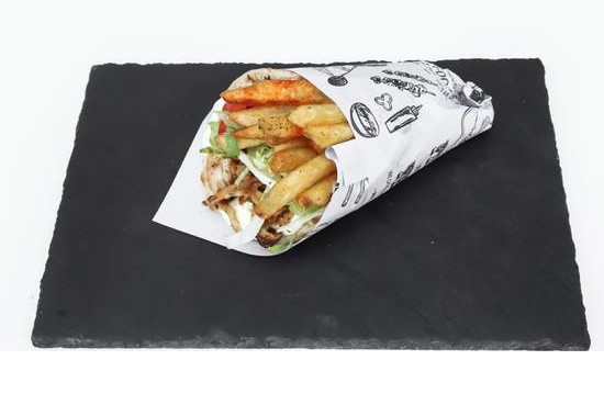 Protein, chips, dip, tomato and onions. Mr. Souvlaki's goodness embraced by our Greek style wrap.