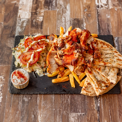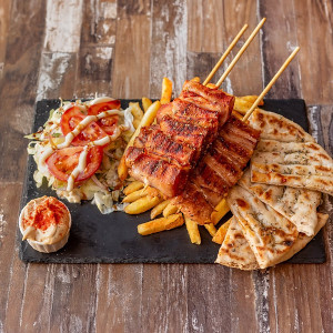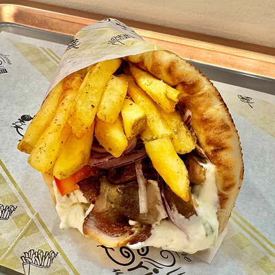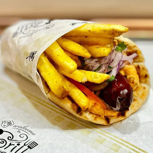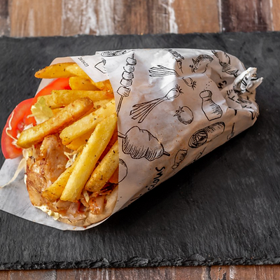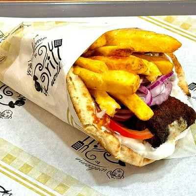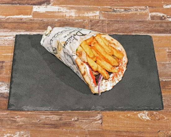 Protein, chips, dip, tomato and onions. Mr. Souvlaki's goodness embraced by our Greek style wrap.