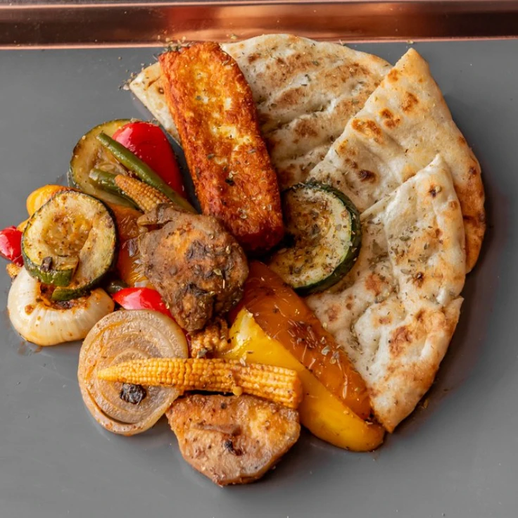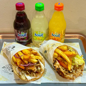 Protein, chips, dip, tomato, lettuce and onions. Mr. Souvlaki's goodness embraced by our Greek style wrap.